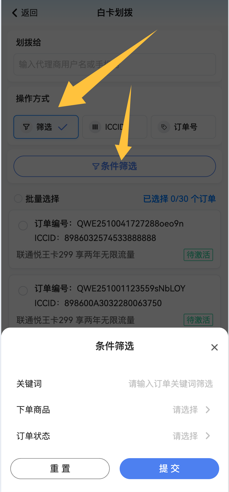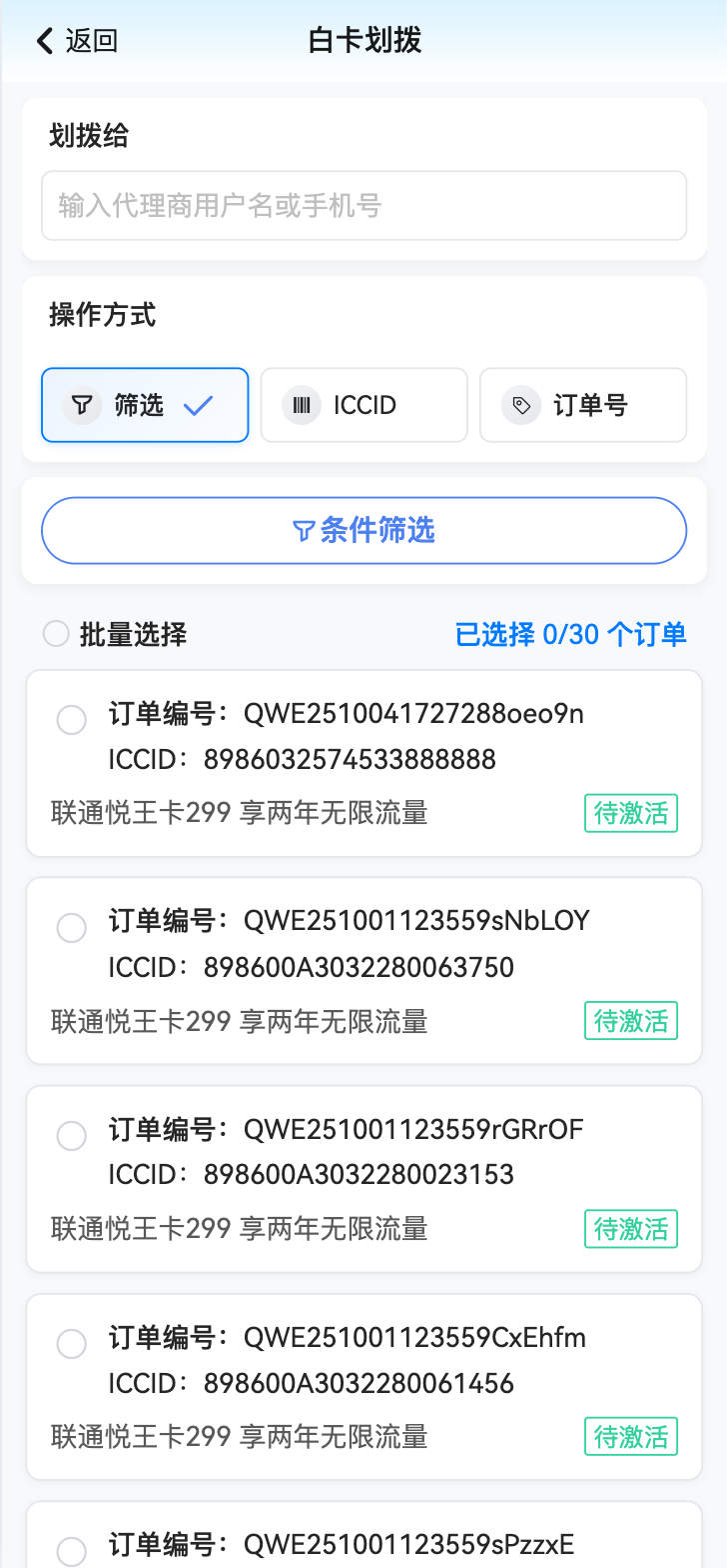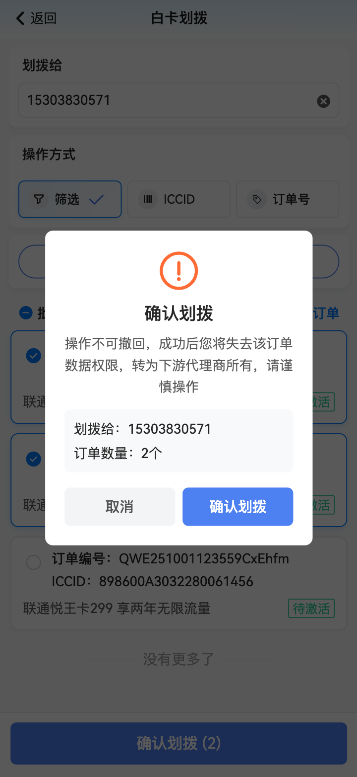 此方式支持代理商使用,可将名下白卡划转给平台任意代理商(适配多门店调货需求);筛选数据仅显示实体卡类目含 ICCID、且订单状态非 “已激活 / 已发货 / 已签收” 的信息,需注意:PC 端筛选无此限制但不支持代理商使用