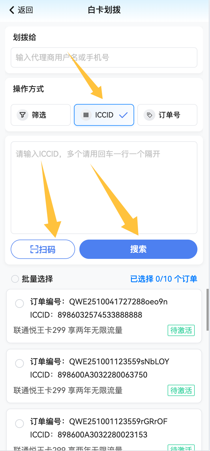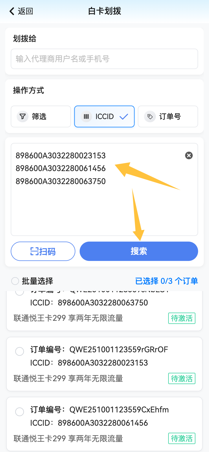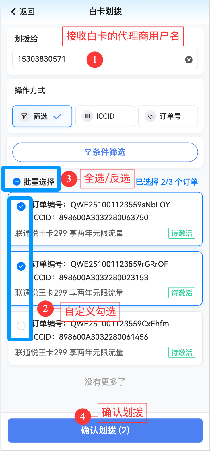此方式支持代理商使用,可将名下白卡划转给平台任意代理商(适配多门店调货需求);筛选数据仅显示实体卡类目含 ICCID、且订单状态非 “已激活 / 已发货 / 已签收” 的信息,需注意:PC 端筛选无此限制但不支持代理商使用