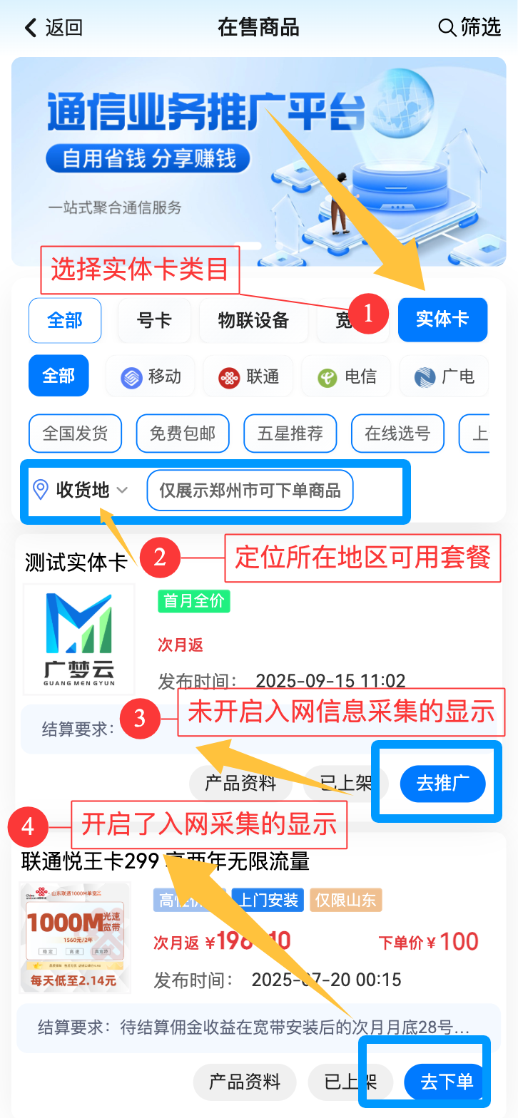 - 本文档讲解实体卡类目商品的上架与销售方法。该类目可用于门店铺设线下卡的线上分佣与数据管理,还能结合商户端 APP 实现线下卡入网信息采集(含 NFC 读身份证、证件照采集、活体检测、人脸比对、签名等功能),且平台订单系统对实体卡具备充分兼容支持