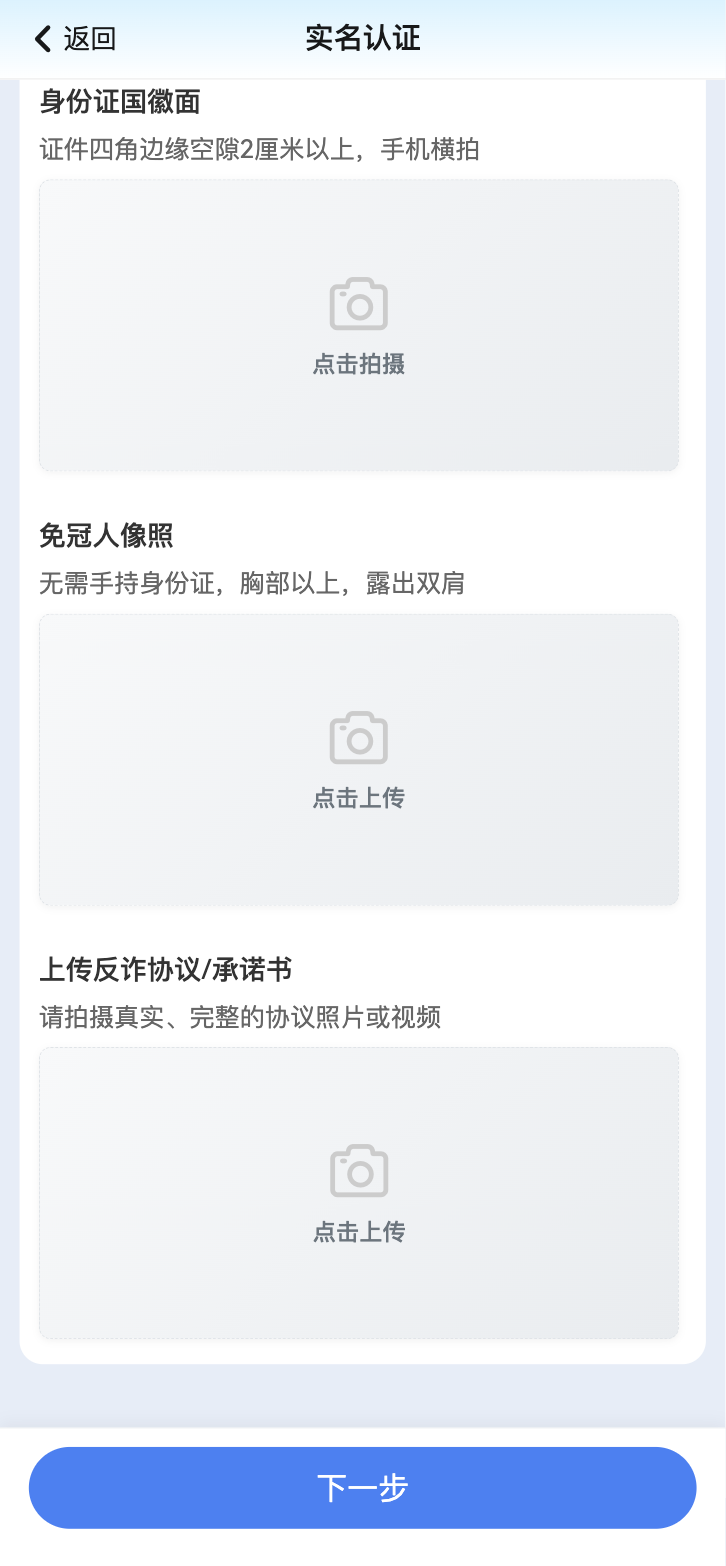 - 上传客户资料,身份证正反面/免冠照,反诈协议承诺书/视频